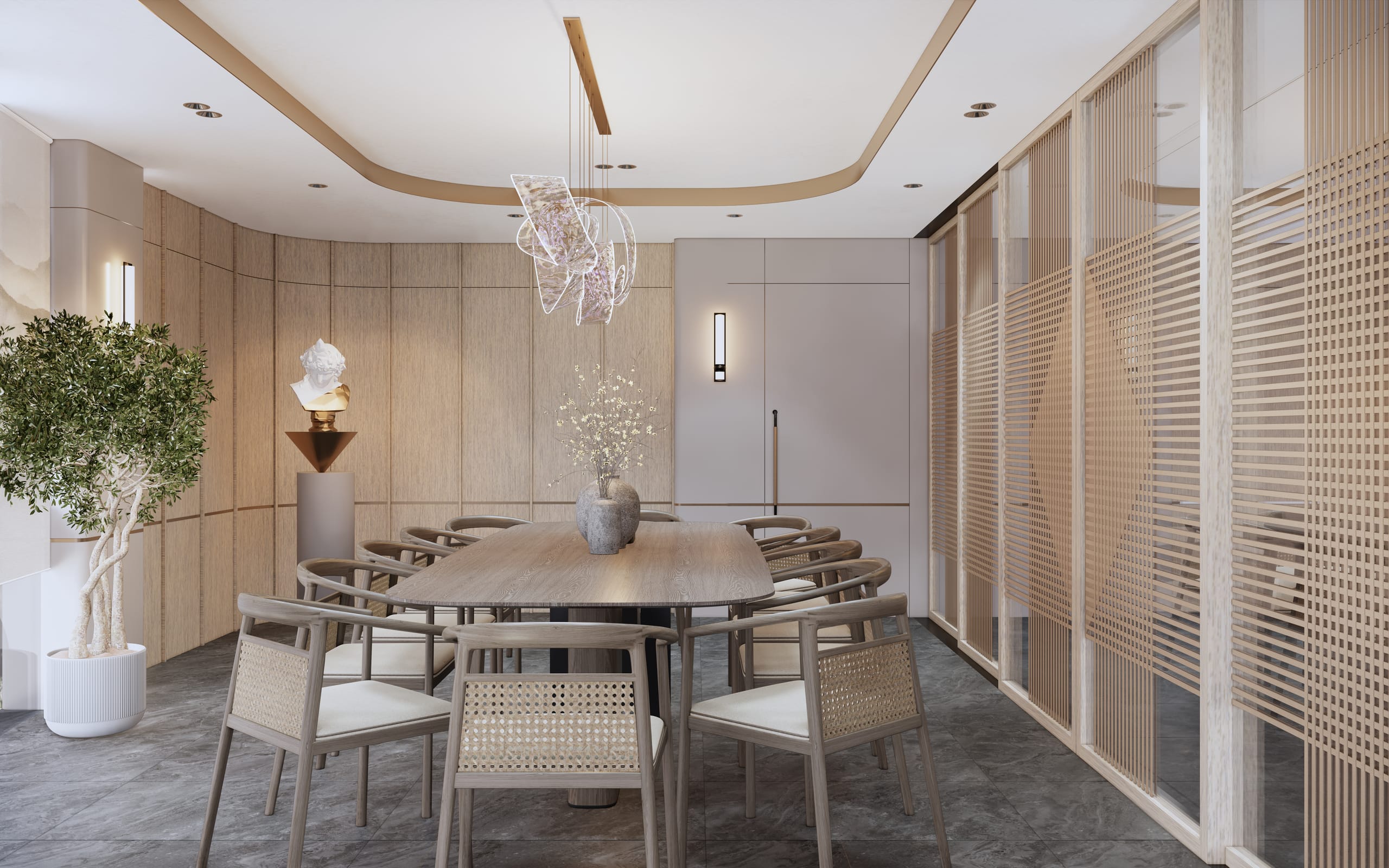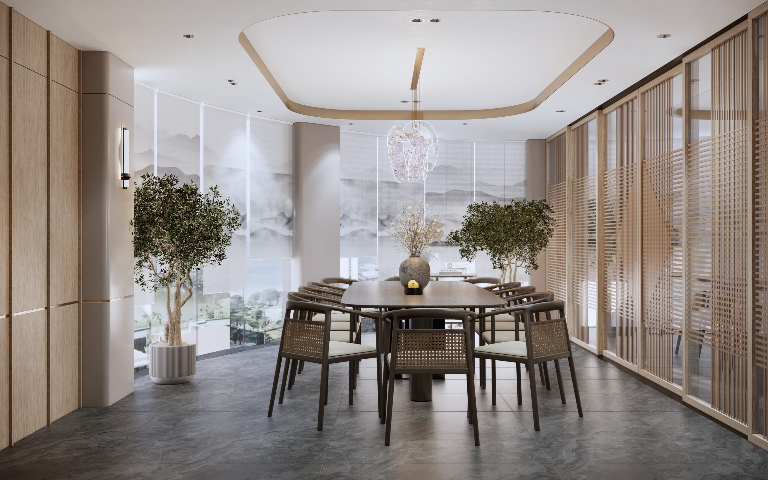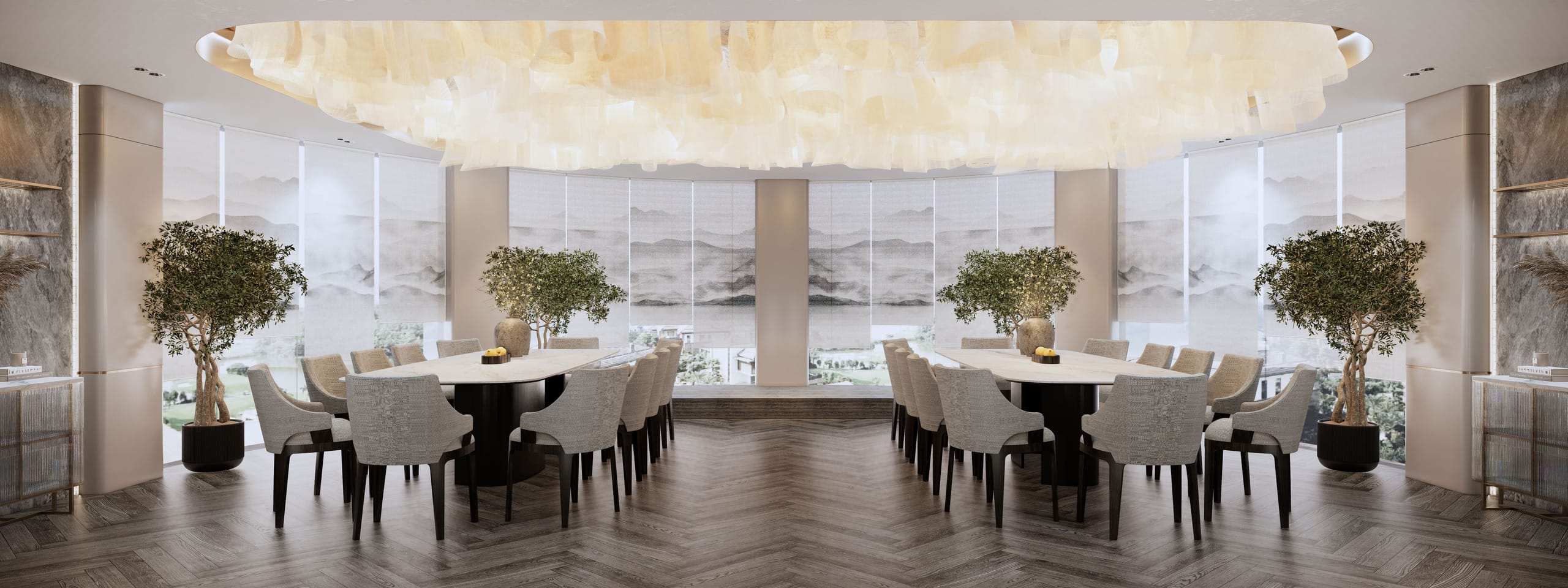 Hai phòng ăn với hai sắc thái khác nhau – một bên kín đáo, riêng tư, một bên mở thoáng, giao hòa thiên nhiên – nhưng cùng chung một ngôn ngữ thẩm mỹ hiện đại, sang trọng, được nâng tầm bởi chất liệu và chi tiết hoàn thiện cao cấp. Đây là nơi các buổi tiệc tiếp khách không chỉ trọn vẹn về ẩm thực, mà còn trở thành những trải nghiệm đẳng cấp, đáng nhớ của CĐT.