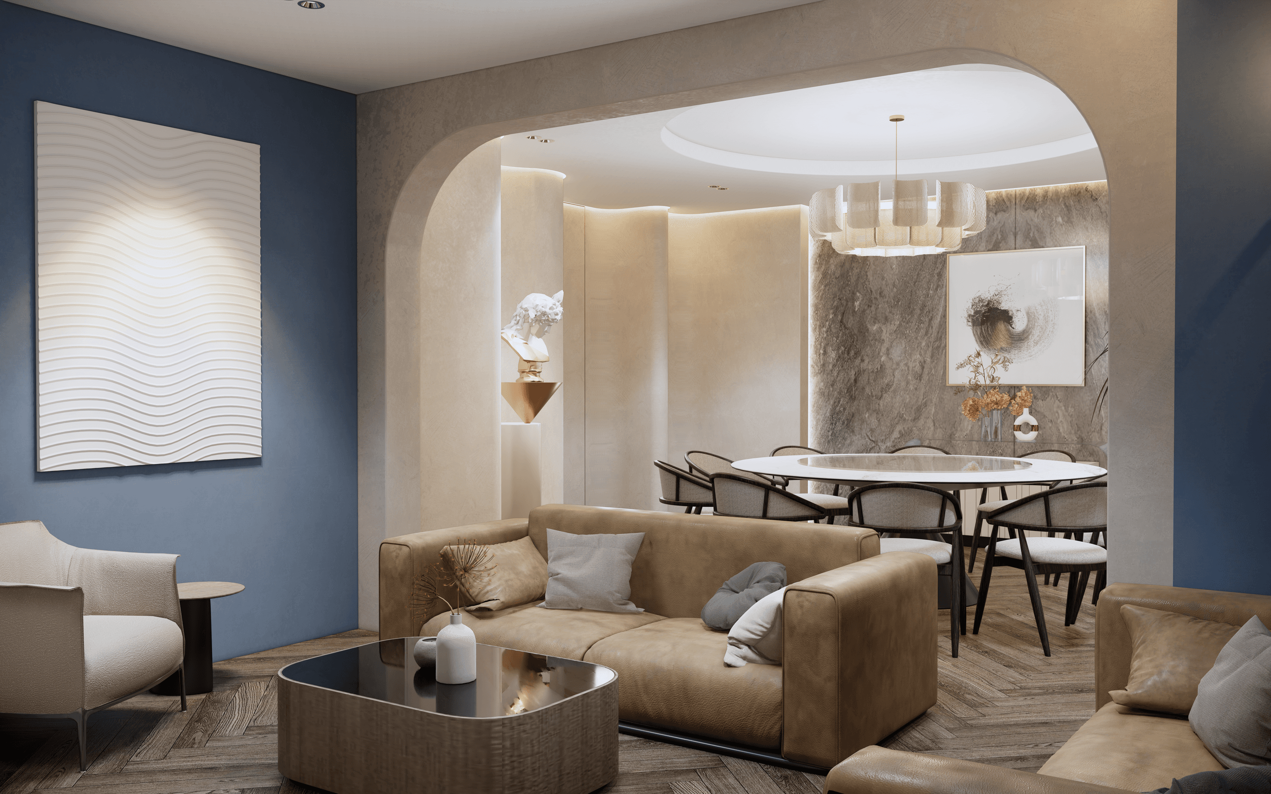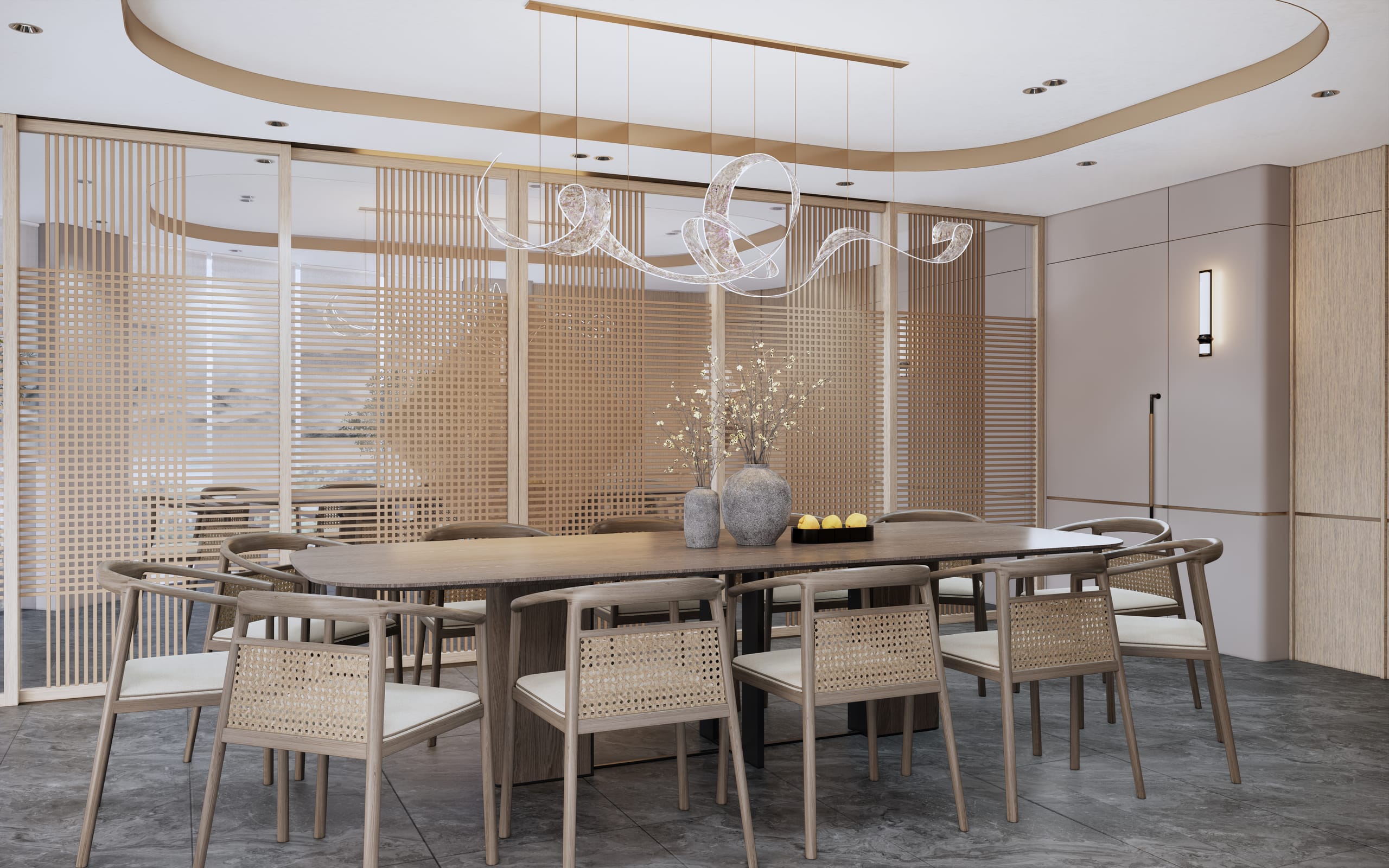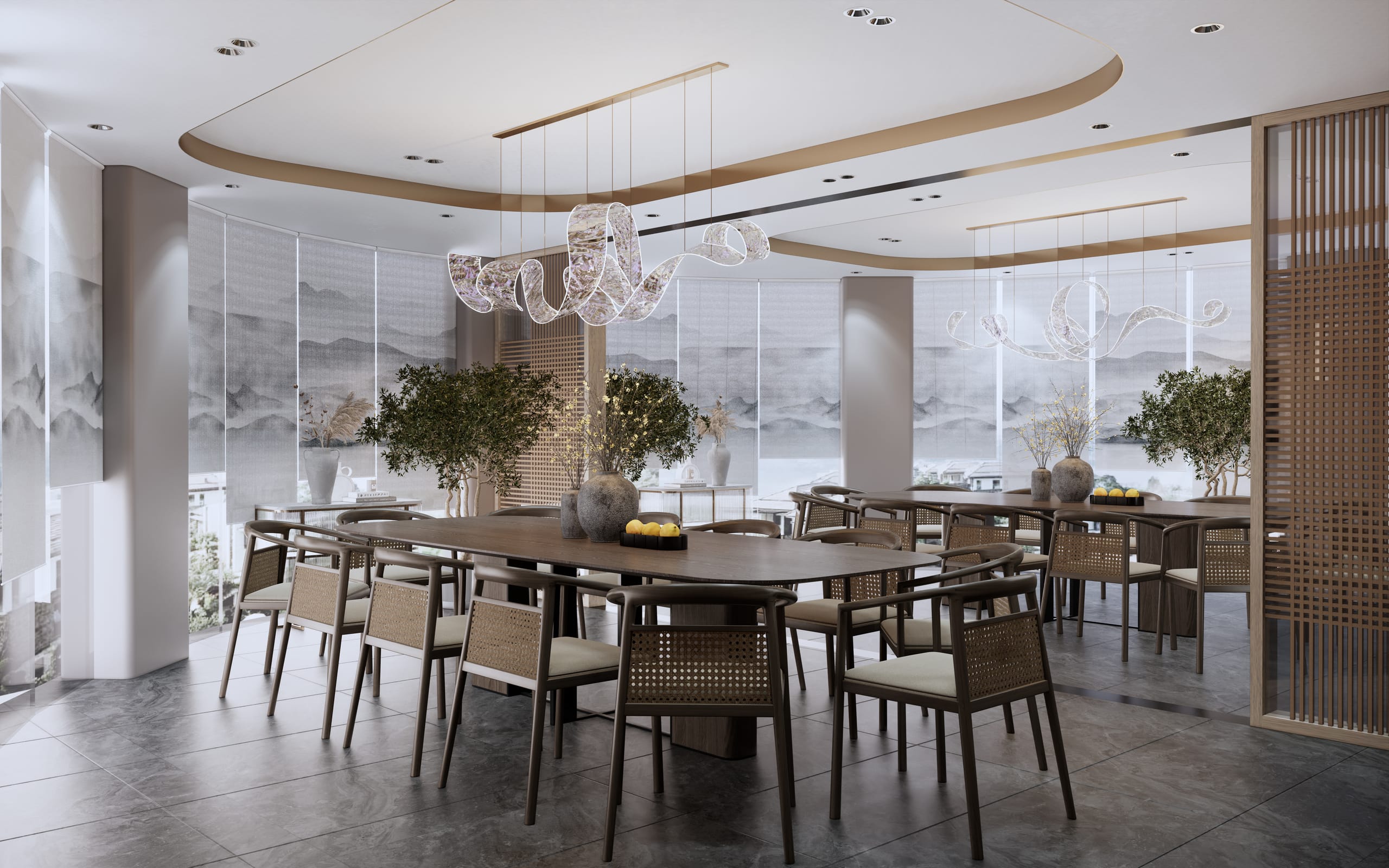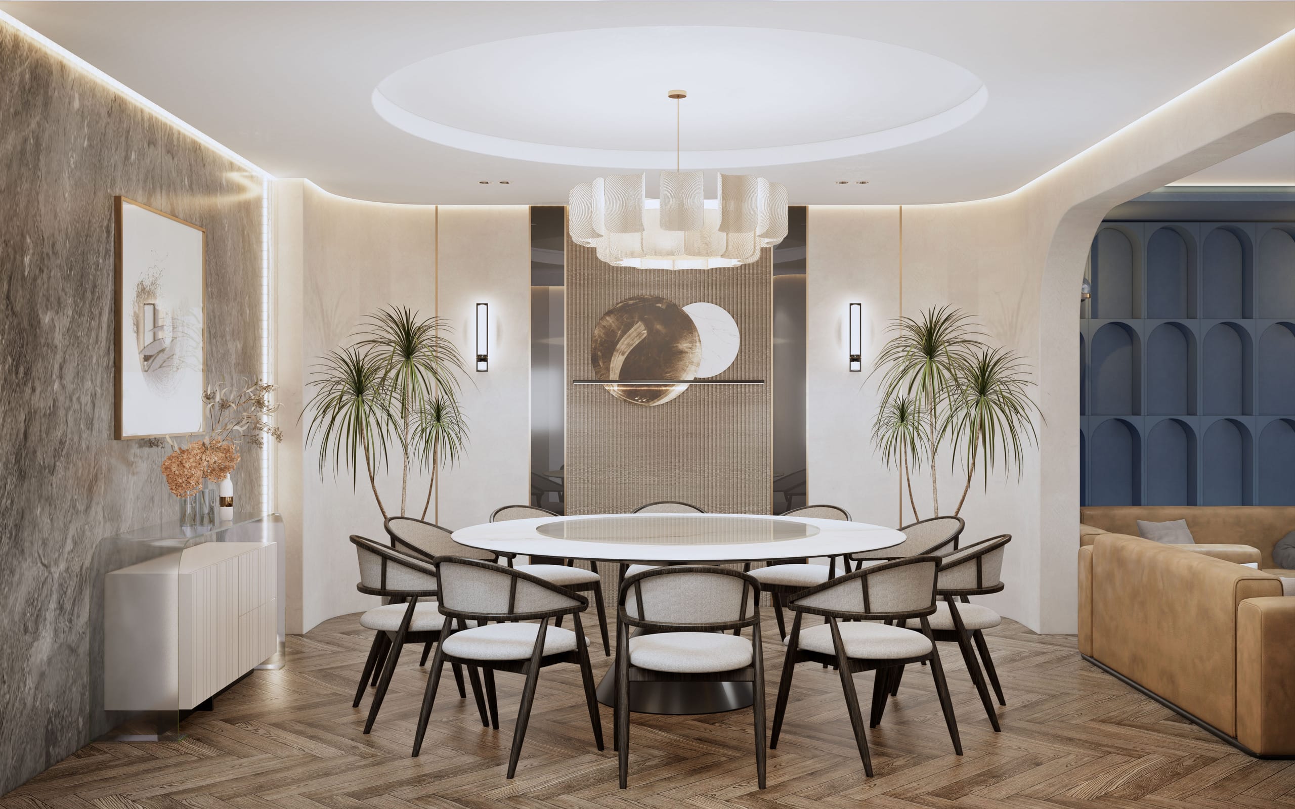 Hai phòng ăn với hai sắc thái khác nhau – một bên kín đáo, riêng tư, một bên mở thoáng, giao hòa thiên nhiên – nhưng cùng chung một ngôn ngữ thẩm mỹ hiện đại, sang trọng, được nâng tầm bởi chất liệu và chi tiết hoàn thiện cao cấp. Đây là nơi các buổi tiệc tiếp khách không chỉ trọn vẹn về ẩm thực, mà còn trở thành những trải nghiệm đẳng cấp, đáng nhớ của CĐT.