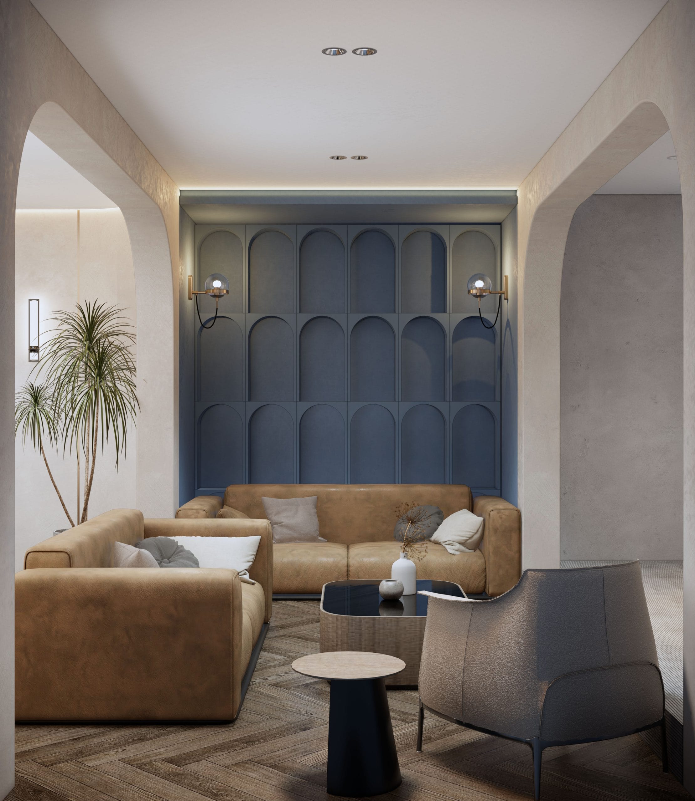 Phòng thứ nhất có diện tích lớn hơn, được định hình mặt bằng nửa hình tròn, với một mảng kính cong toàn phần nhìn ra khu vườn cảnh quan xanh mát. Đây là điểm nhấn chủ đạo, tạo nên cảm giác thư thái, thoáng đãng và gần gũi với thiên nhiên – một đặc quyền dành cho khách mời quan trọng.
