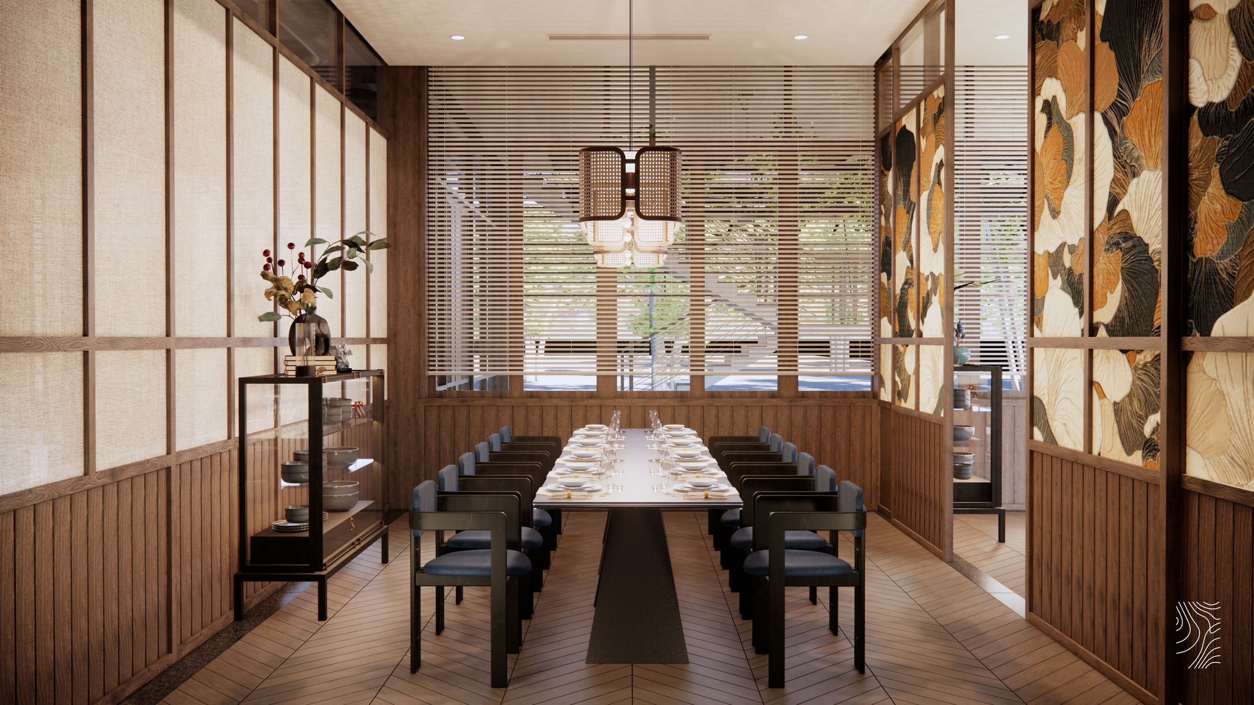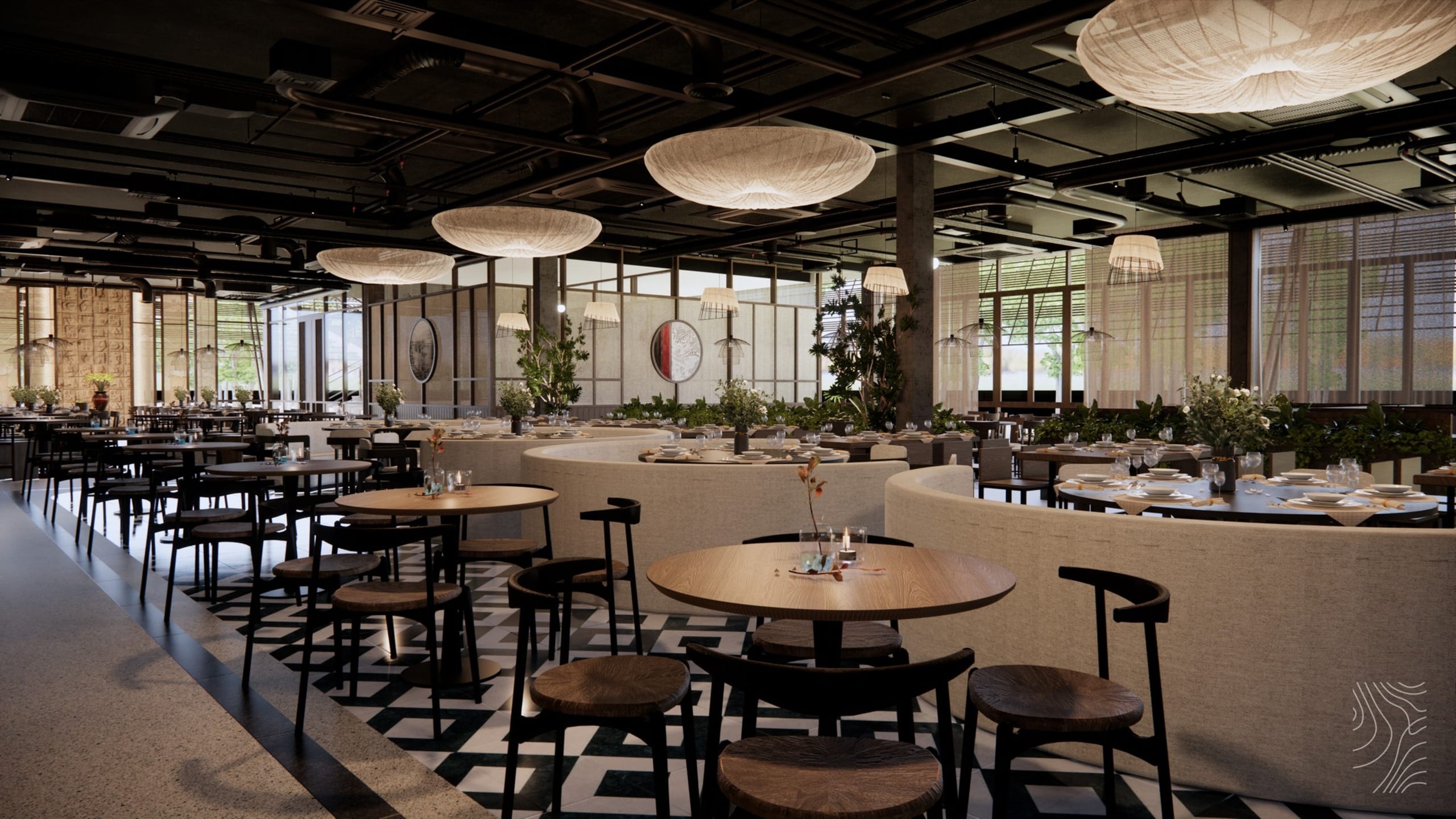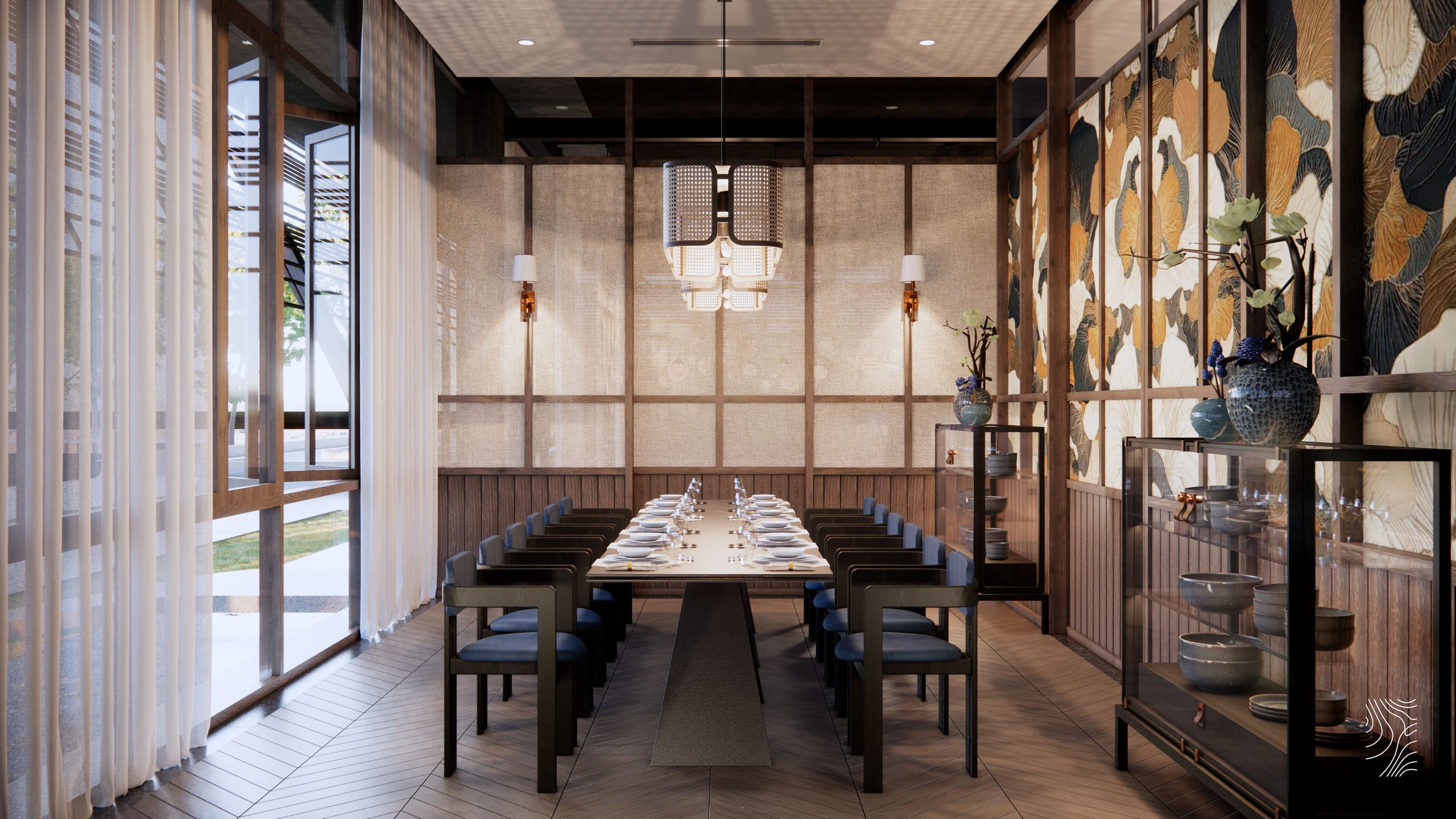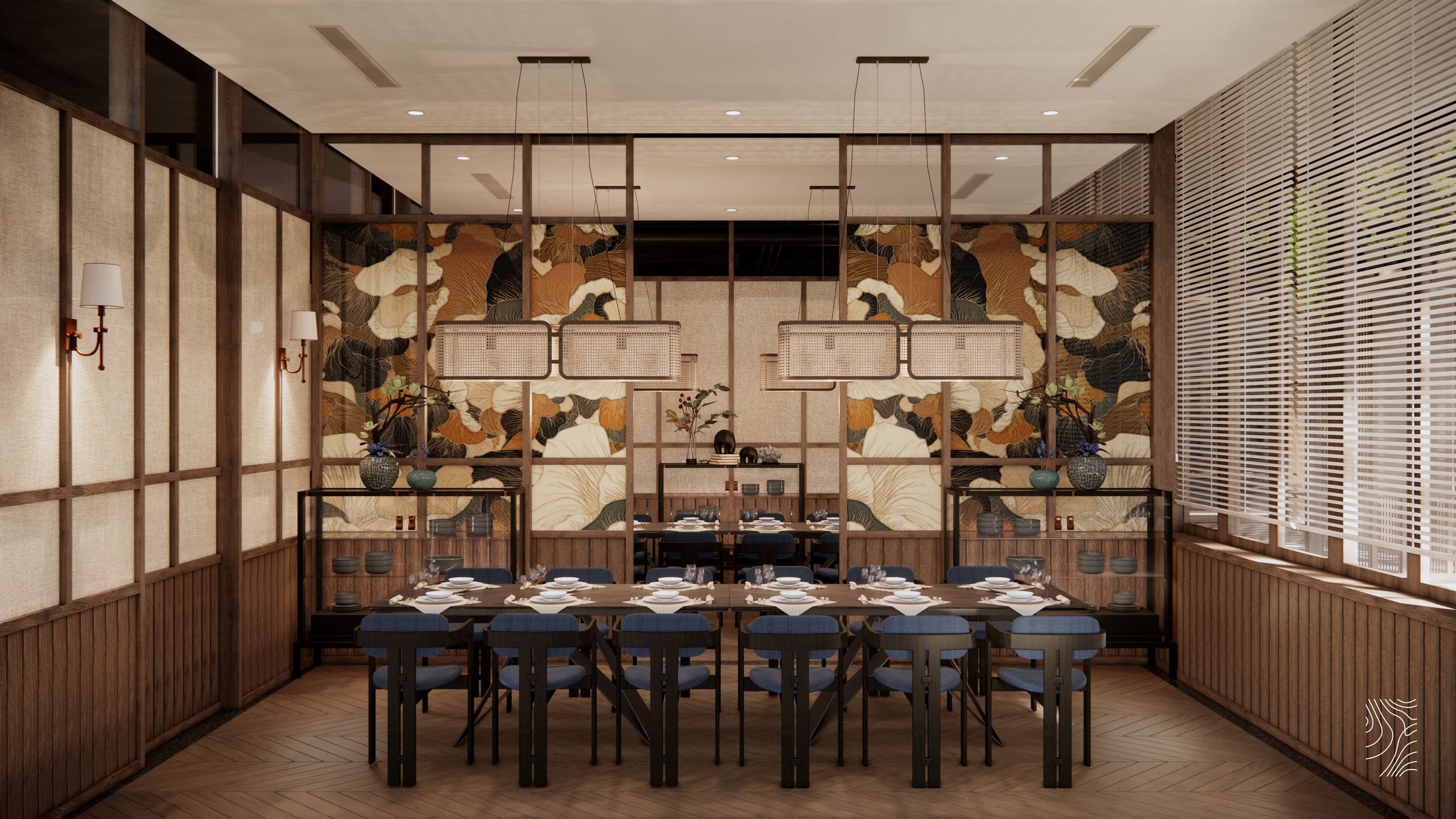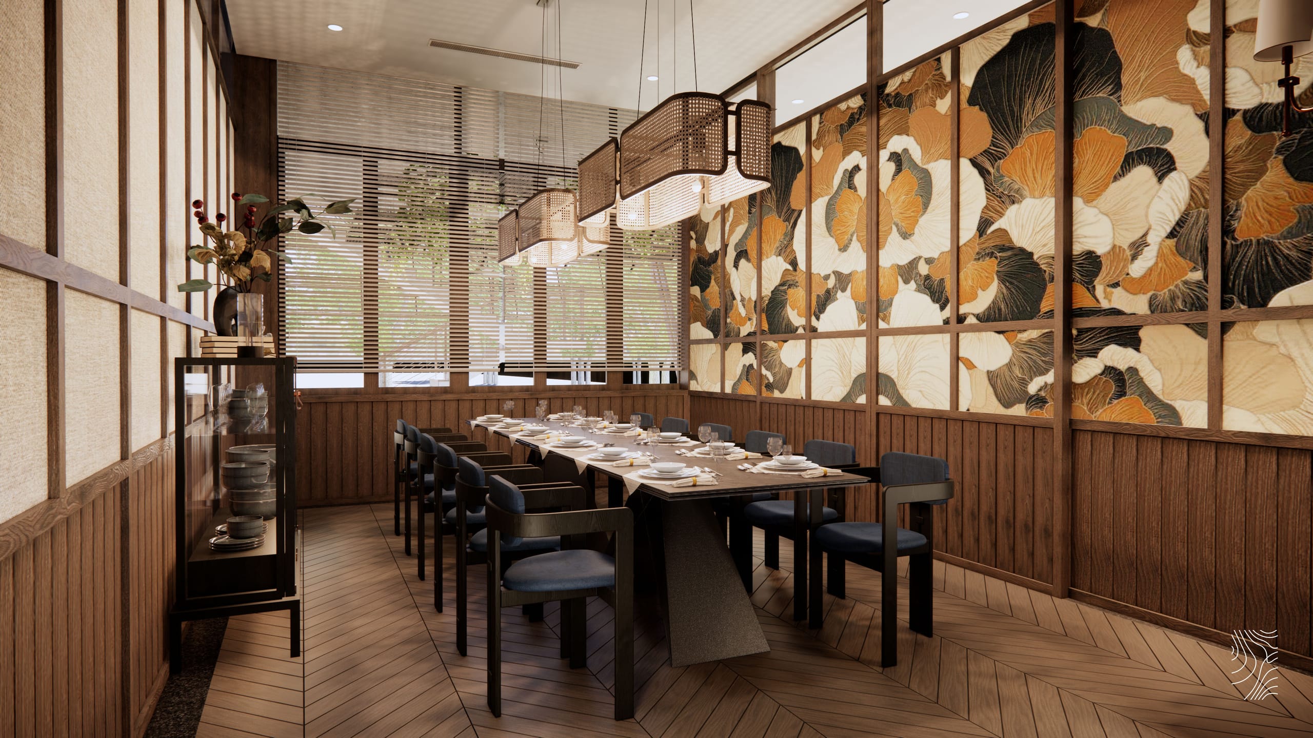 Nhà hàng được thiết kế theo phong cách đương đại với những đường nét tinh tế, kết hợp các yếu tố truyền thống và hiện đại để tạo ra không gian vừa sang trọng, vừa gần gũi. Chất liệu gỗ tự nhiên, đá tự nhiên và kính trong suốt được sử dụng để tạo sự thông thoáng và ánh sáng tự nhiên. Tầng 1 được bố trí với phòng ăn À la carte lớn cùng các phòng ăn 50 chỗ ngồi, phòng ăn Vip 10 chỗ ngồi. Trung tâm của tầng 2 nhà hàng được thiết kế với một khu vực lớn dành cho sự kiện, hội nghị, hay các bữa tiệc lớn, nơi mọi người có thể thưởng thức ẩm thực đặc sắc trong một không gian ấm cúng, nhưng cũng rất hiện đại.