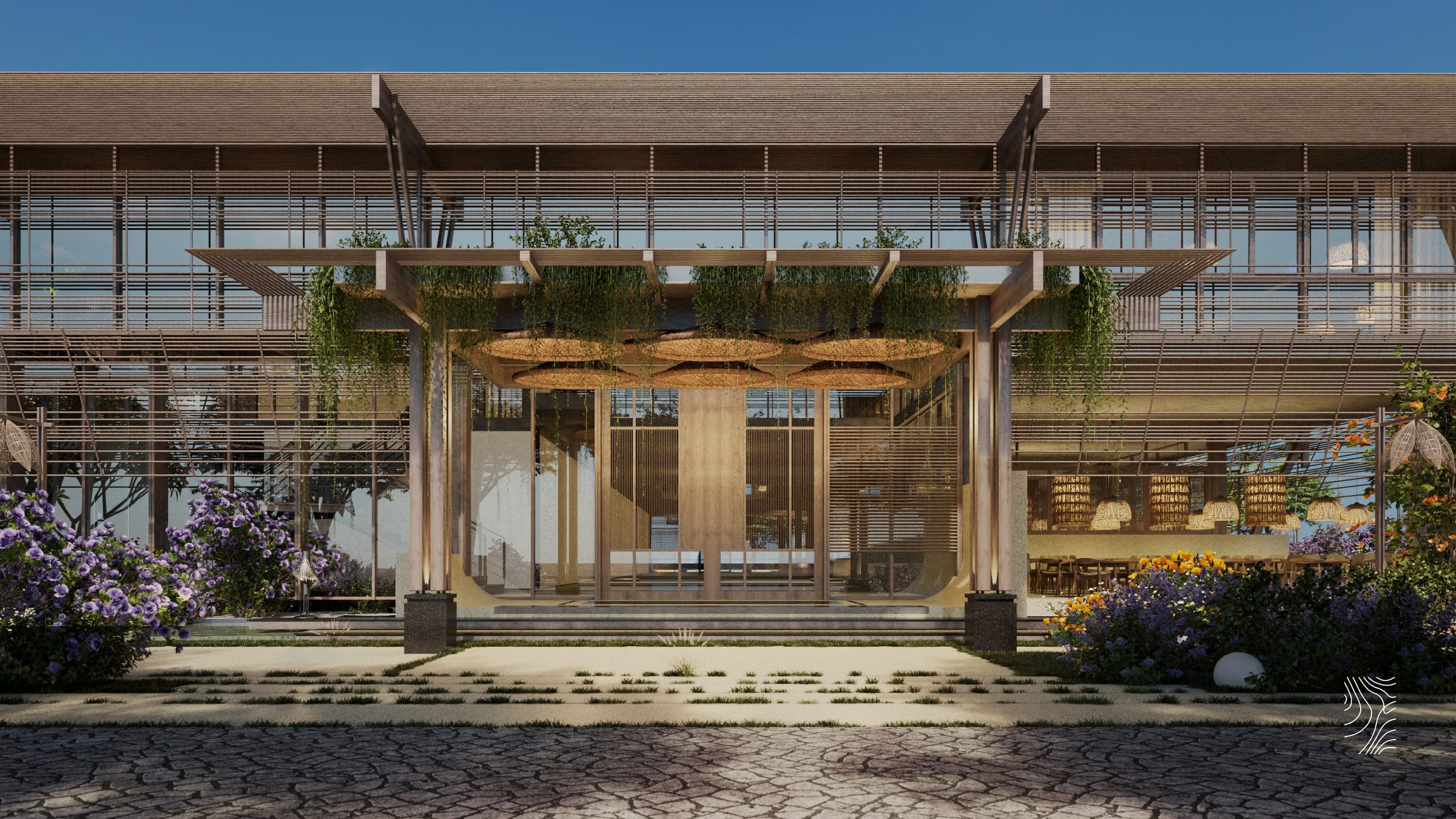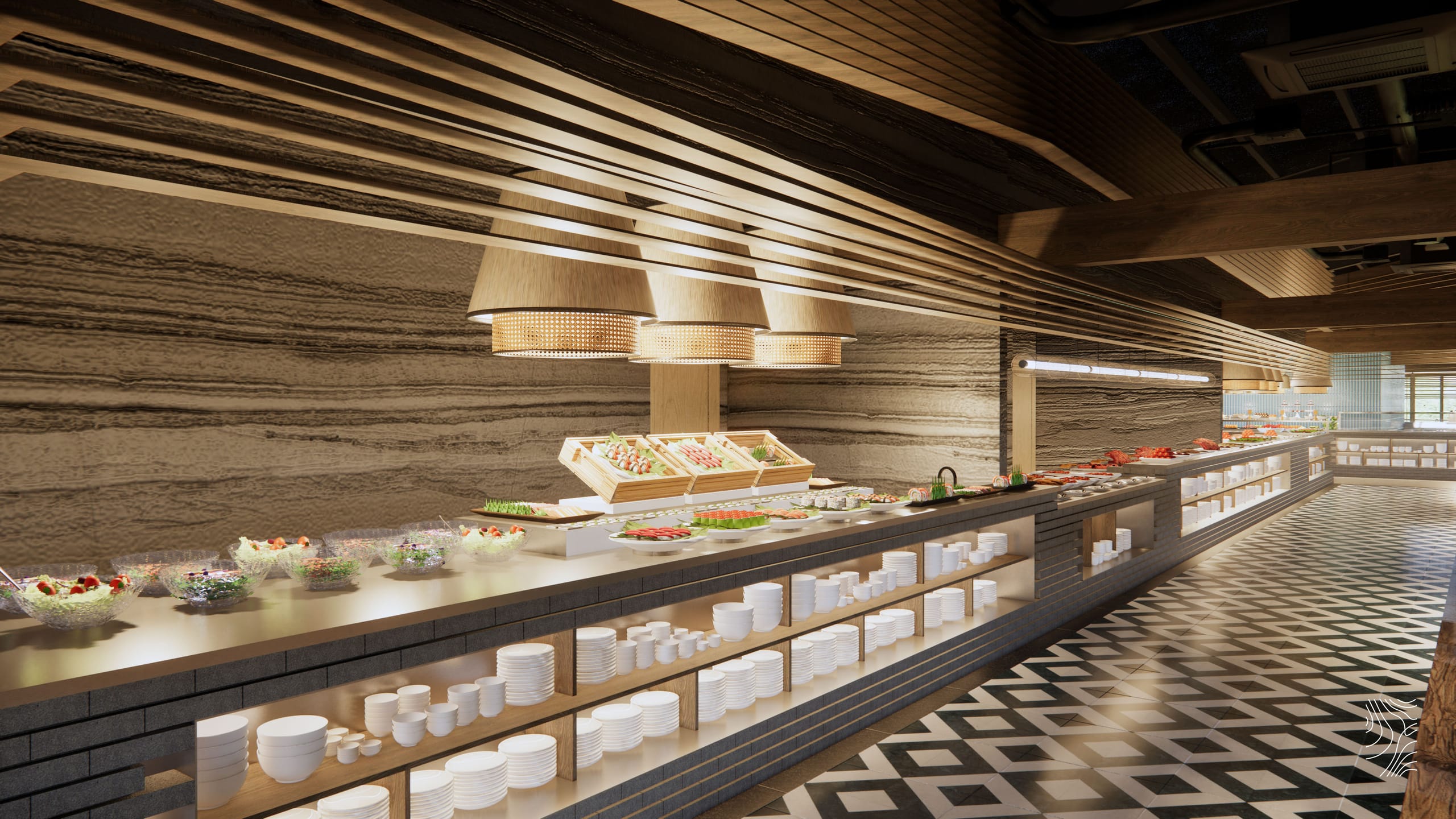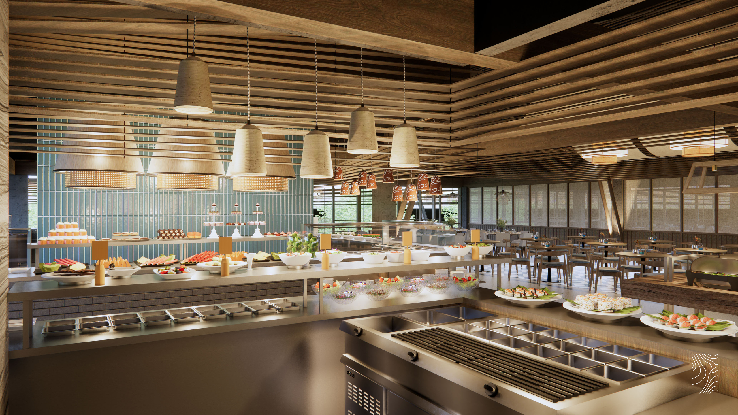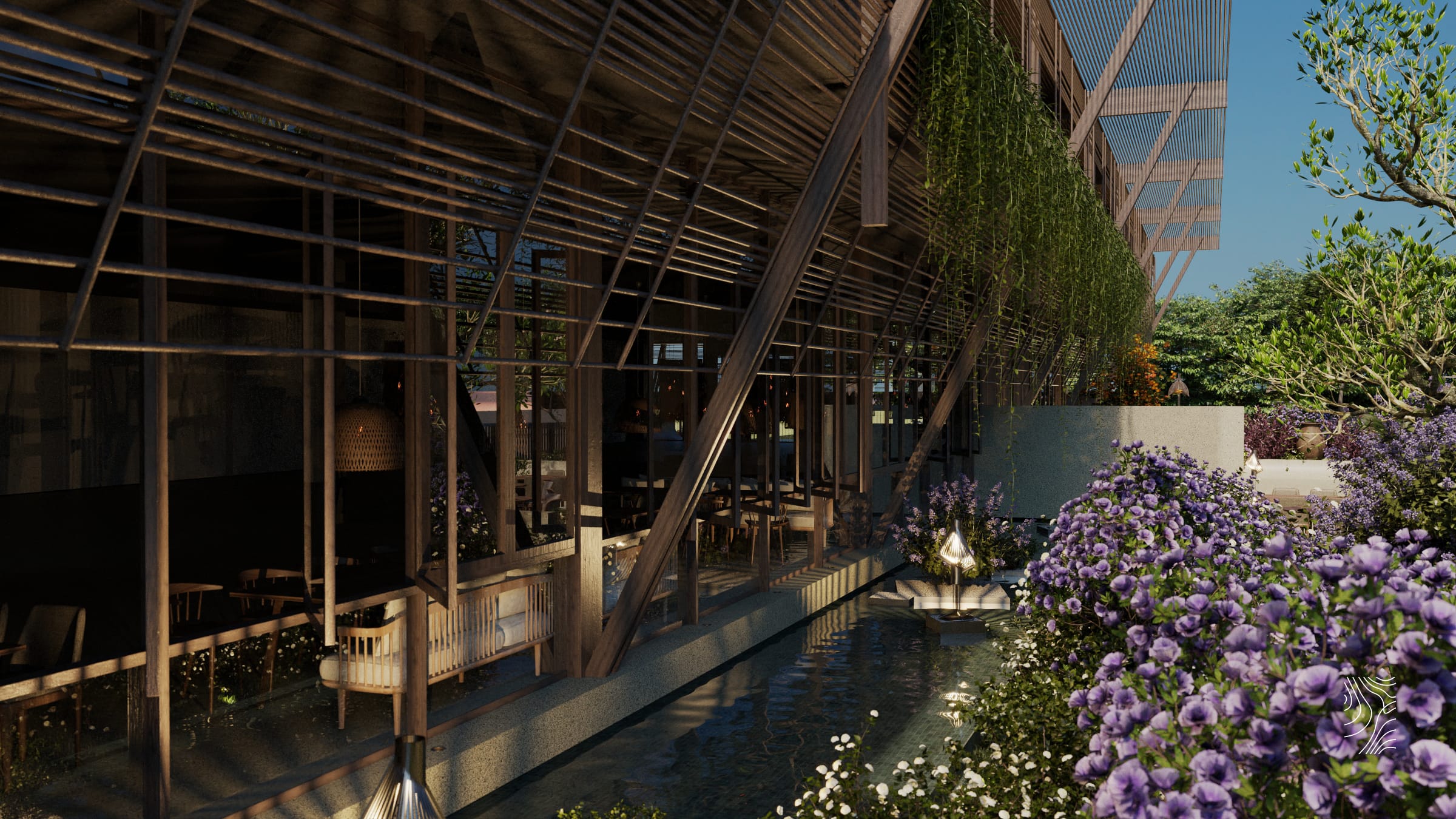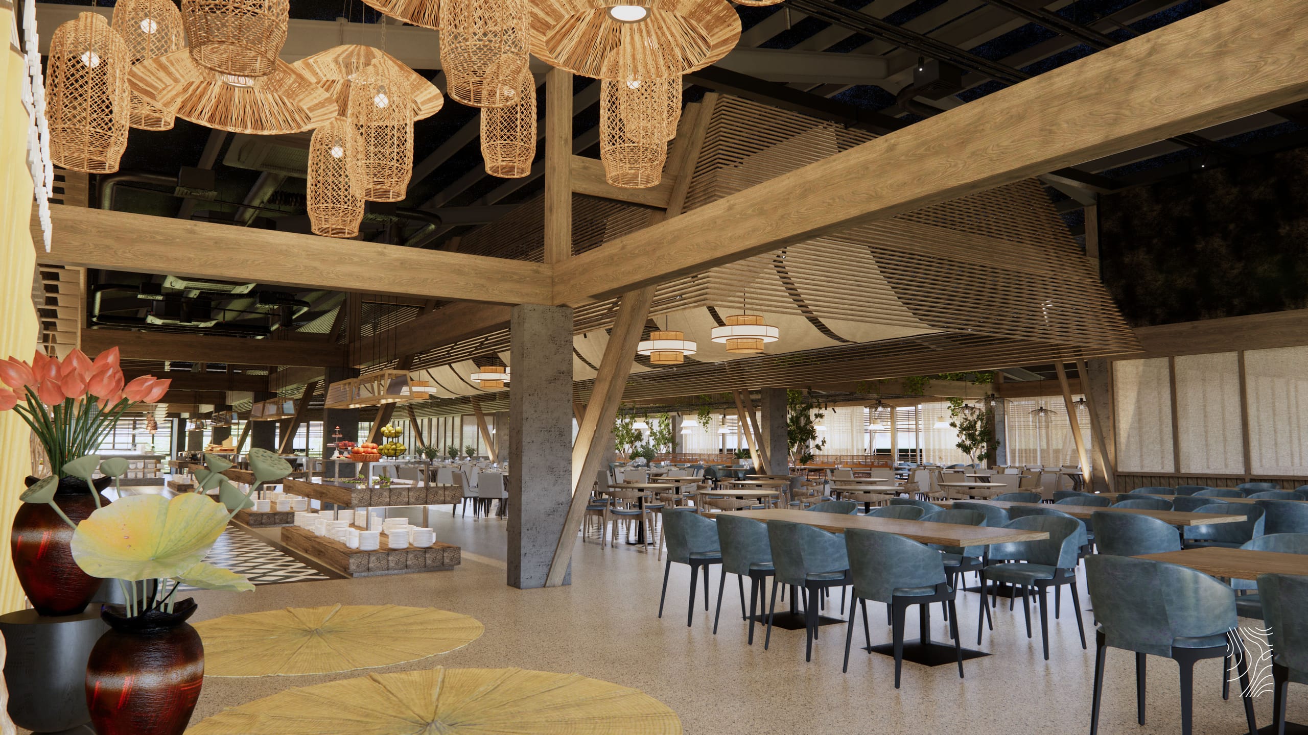 Nhà hàng được thiết kế theo phong cách đương đại với những đường nét tinh tế, kết hợp các yếu tố truyền thống và hiện đại để tạo ra không gian vừa sang trọng, vừa gần gũi. Chất liệu gỗ tự nhiên, đá tự nhiên và kính trong suốt được sử dụng để tạo sự thông thoáng và ánh sáng tự nhiên. Tầng 1 được bố trí với phòng ăn À la carte lớn cùng các phòng ăn 50 chỗ ngồi, phòng ăn Vip 10 chỗ ngồi. Trung tâm của tầng 2 nhà hàng được thiết kế với một khu vực lớn dành cho sự kiện, hội nghị, hay các bữa tiệc lớn, nơi mọi người có thể thưởng thức ẩm thực đặc sắc trong một không gian ấm cúng, nhưng cũng rất hiện đại.