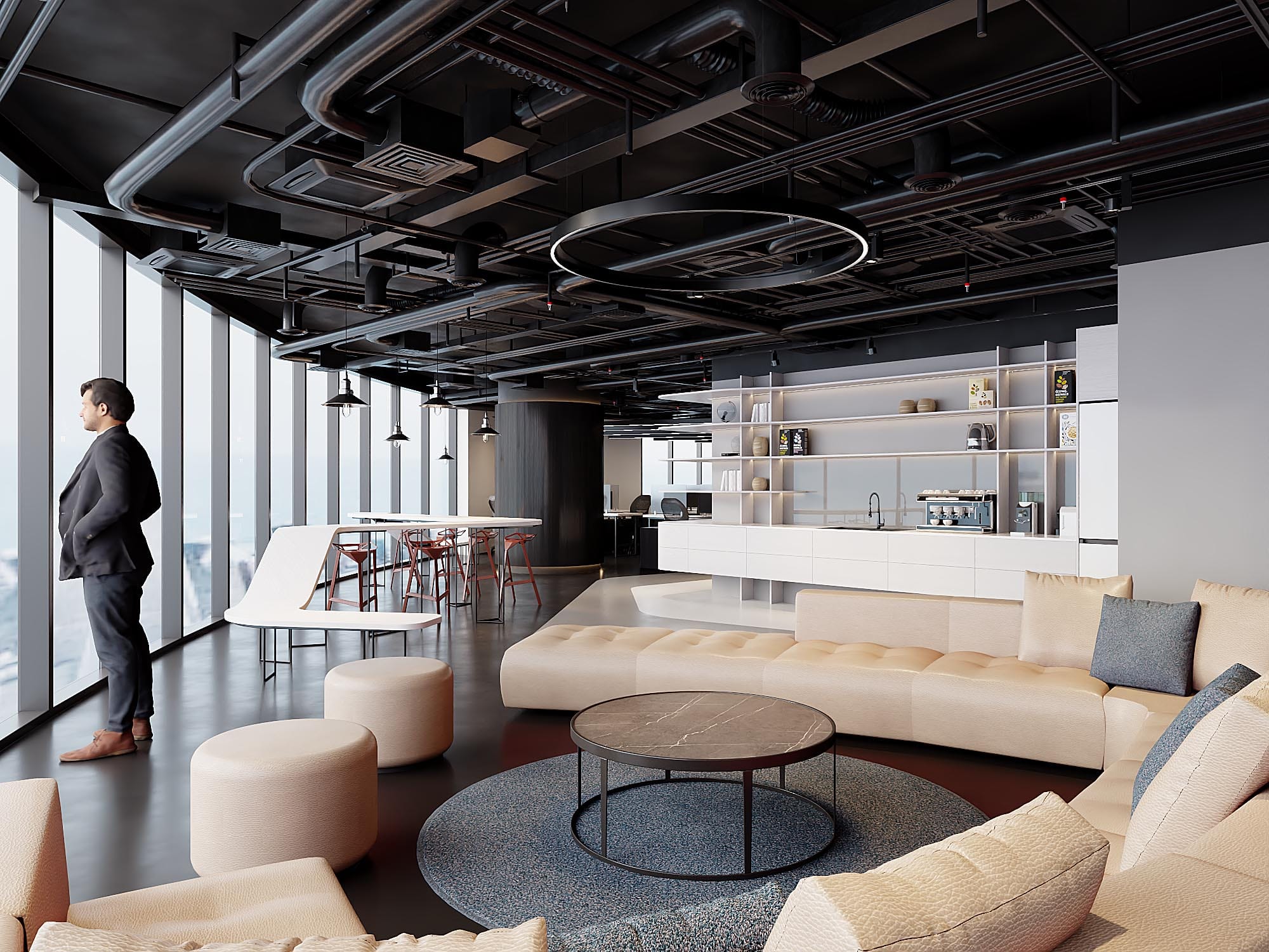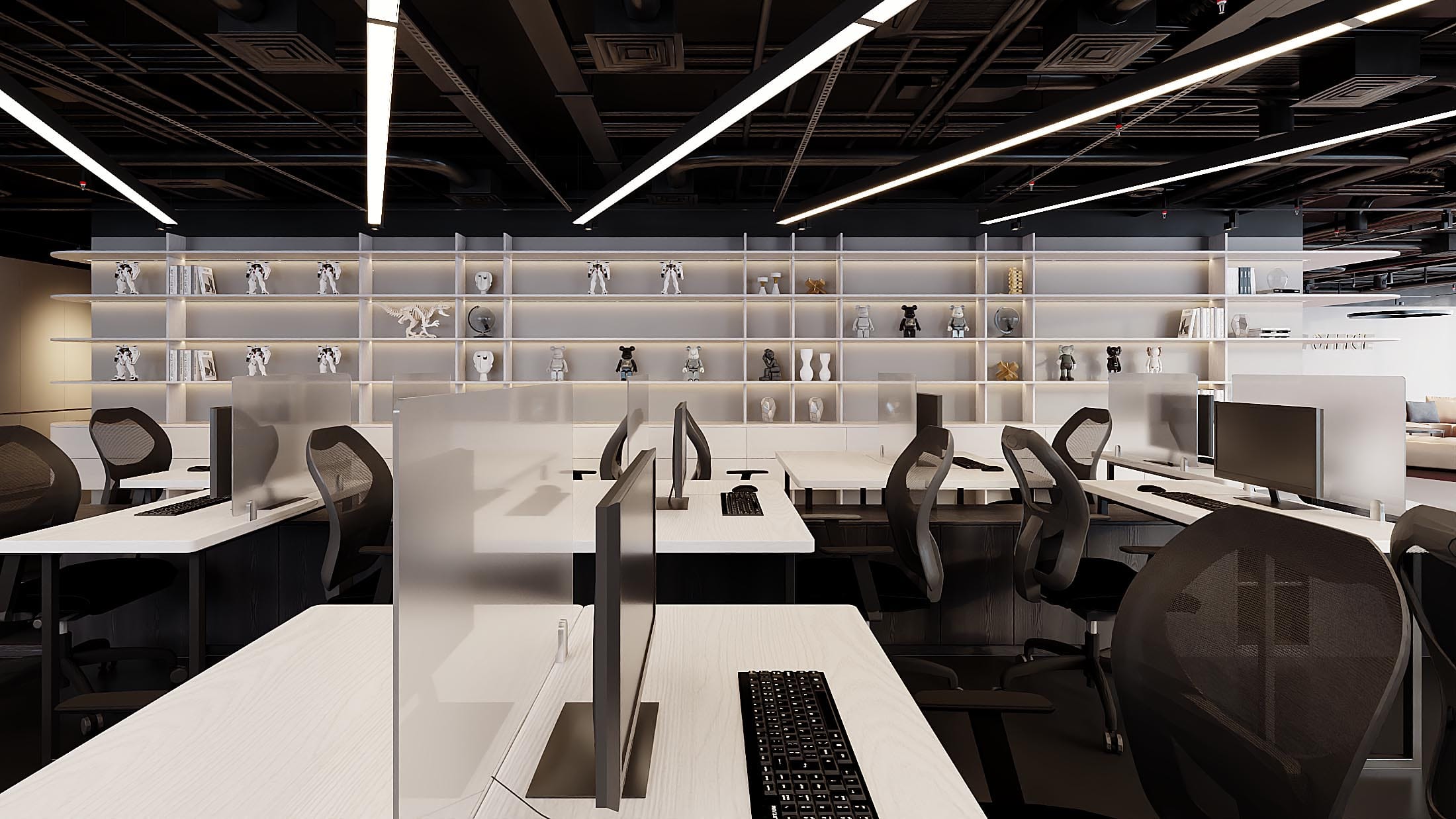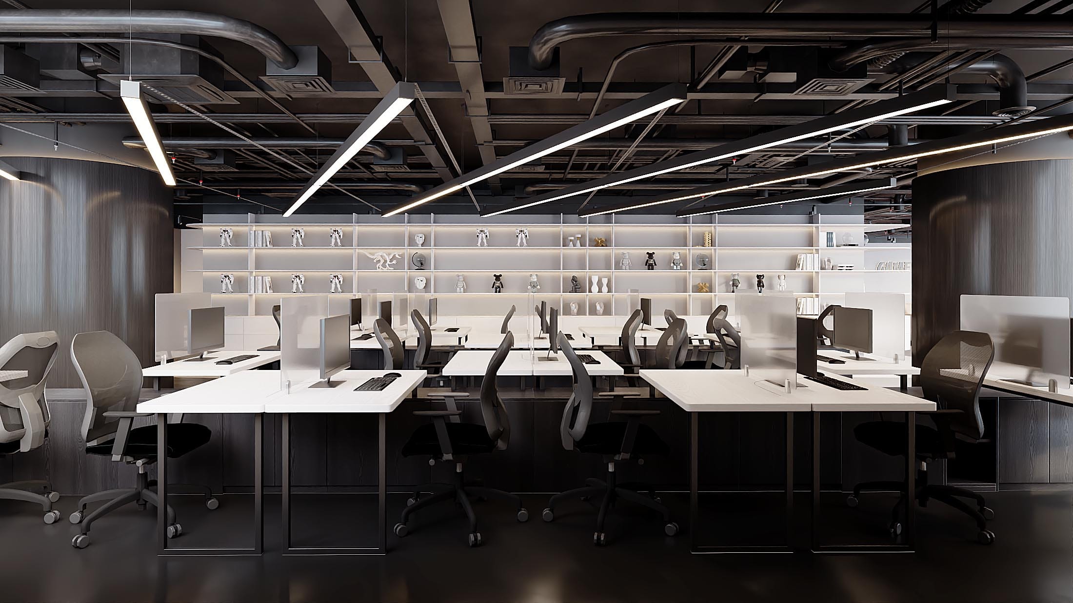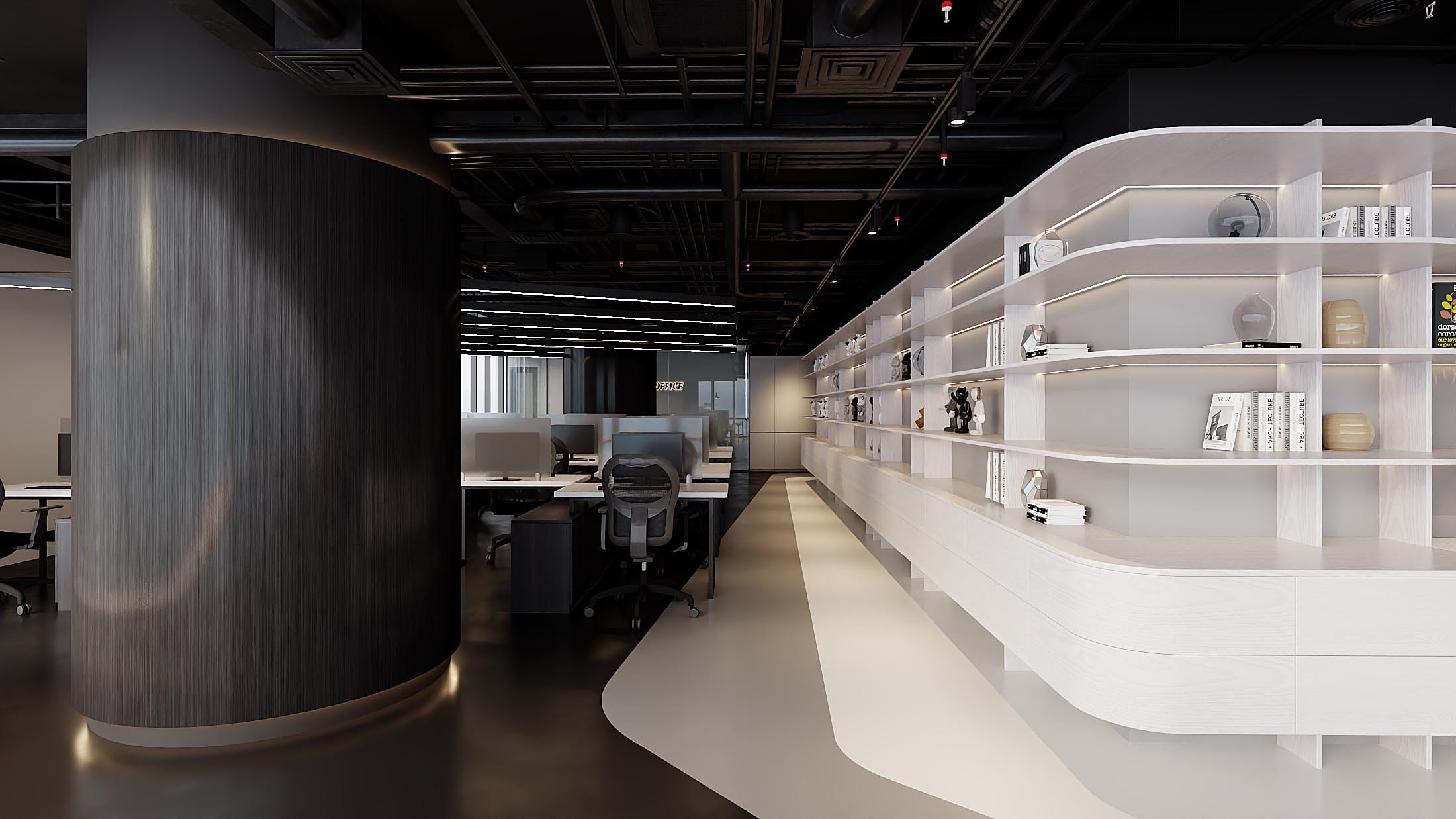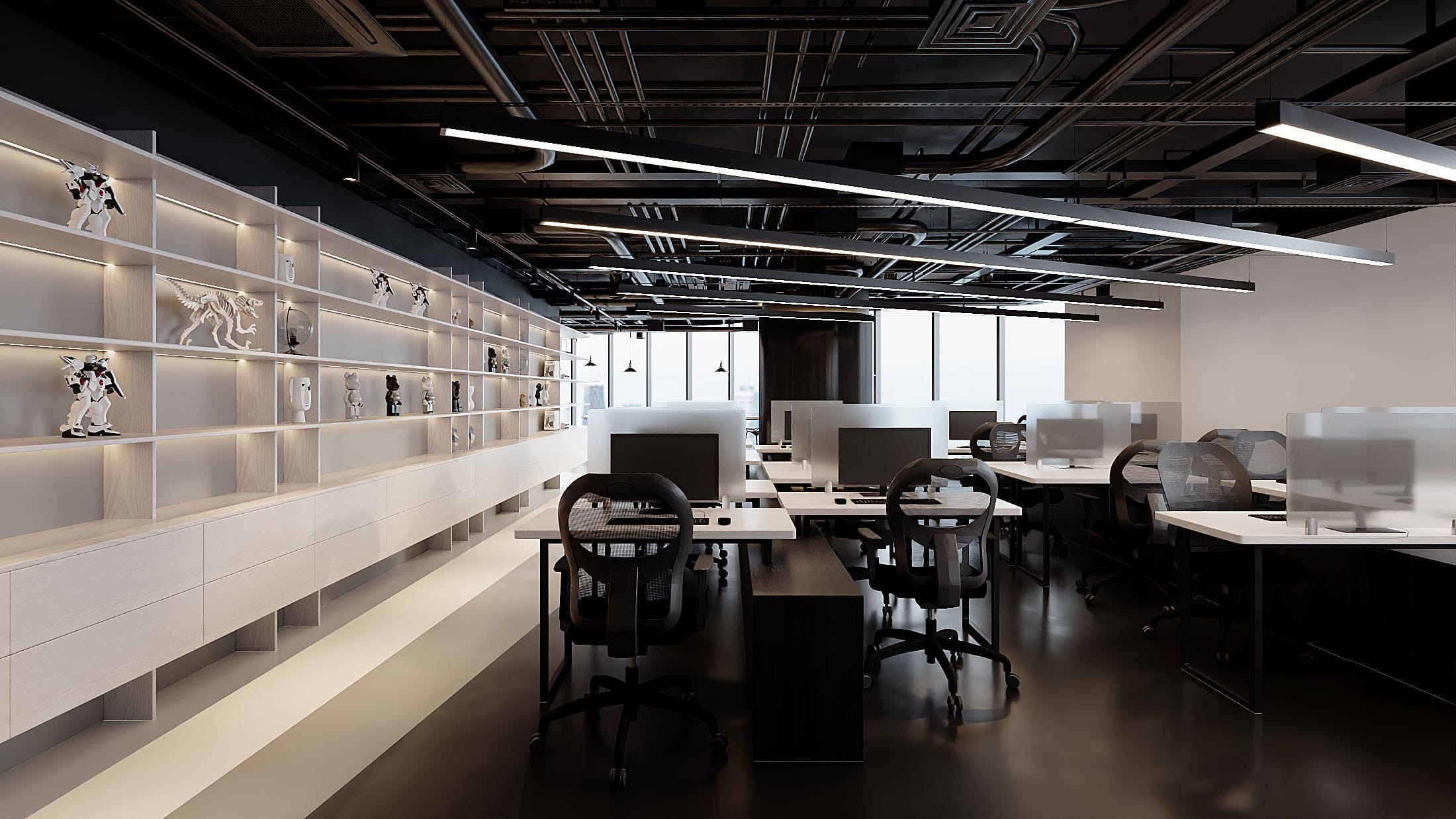 Nằm trong tòa The West – Cầu Giấy (tên cũ Bamboo Airways) Văn phòng Game Jam Việt Nam được thiết kế với tinh thần trẻ trung, linh hoạt và đầy cảm hứng – phản ánh đúng bản sắc của một công ty phát triển game hiện đại. Không gian làm việc được tổ chức mở, đa năng, cho phép dễ dàng chuyển đổi giữa các hoạt động training, làm việc nhóm hay tập trung cá nhân. Phòng họp được bố trí riêng biệt, đảm bảo sự kín đáo và chuyên nghiệp cho các buổi trao đổi quan trọng. Điểm nhấn đặc biệt của văn phòng là khu sảnh đón tiếp kết hợp pantry và tiếp khách, mở ra một mảng kính cong lớn với tầm nhìn rộng, tạo cảm giác thoáng đãng và kết nối với bên ngoài. Sàn nhà sử dụng gam màu đen – trắng phối theo đường cong mềm mại, uốn lượn theo mặt bằng, không chỉ dẫn dắt giao thông mà còn tạo hiệu ứng thị giác mạnh mẽ và năng động. Tổng thể thiết kế tối giản nhưng cá tính, không cần đến các chi tiết phô trương mà vẫn thể hiện rõ một không gian làm việc đầy sáng tạo và chuyên nghiệp dành riêng cho những người làm game.